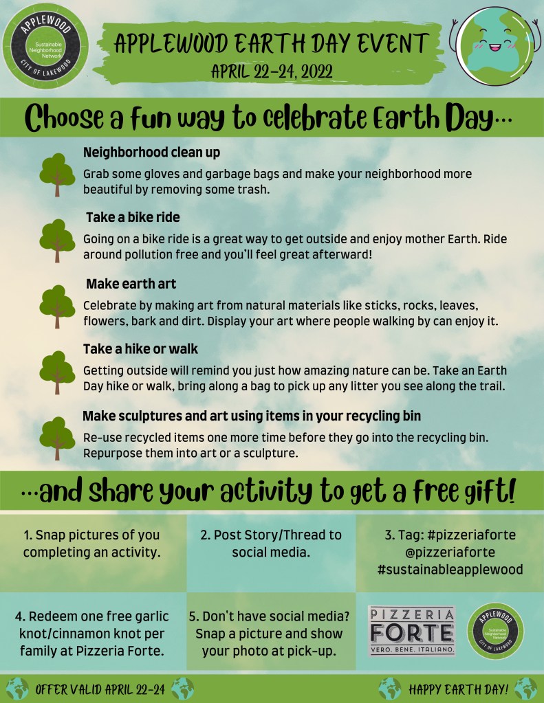 Applewood Earth Day Event Choose an activity and get a free gift from Pizzeria Forte! Share this: Click to share on Facebook (Opens in new window) Facebook