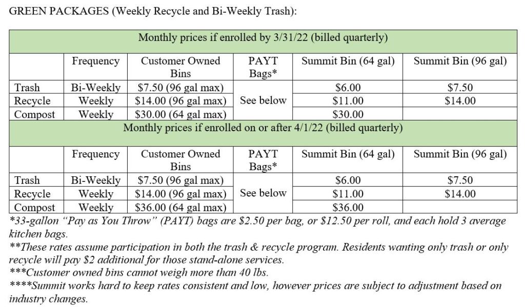Our pricing packages are included below – “Green” packages have more frequent recycling pick up and “Standard” packages have more frequent trash pick up. “Pay as you throw” allows participants to only pay for trash when needed – the more you recycle or compost, the more you save money and our environment! To take advantage of best pricing, residents must sign up for both recycling and trash, and can add compost services if desired.